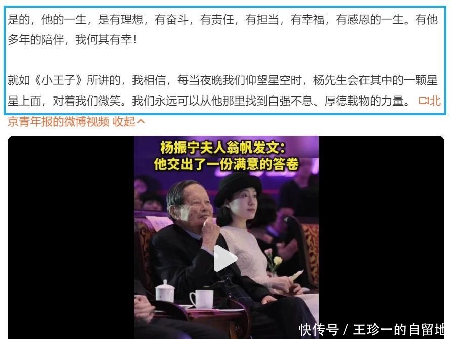 杨振宁去世第二天,翁帆就通过《光明日报》发声。