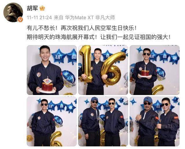 前一天,胡军曾发文祝儿子胡皓康生日快乐,“有儿不愁长!再次祝我们人民空军生日快乐!期待明天的珠海航展开幕式!让我们一起见证祖国的强大!”