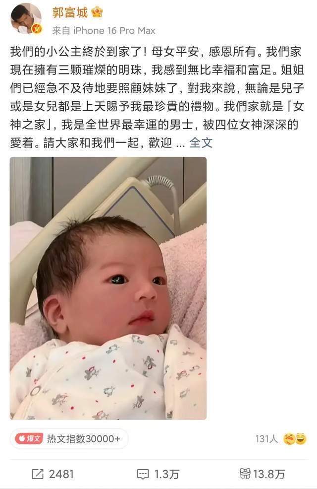 尤其是郭富城发文官宣内容,字里行间都能感受到作为爸爸的喜悦,以及对三宝的珍视。甚至当天亲自驾车和父母一起迎接三宝和老婆的出院。