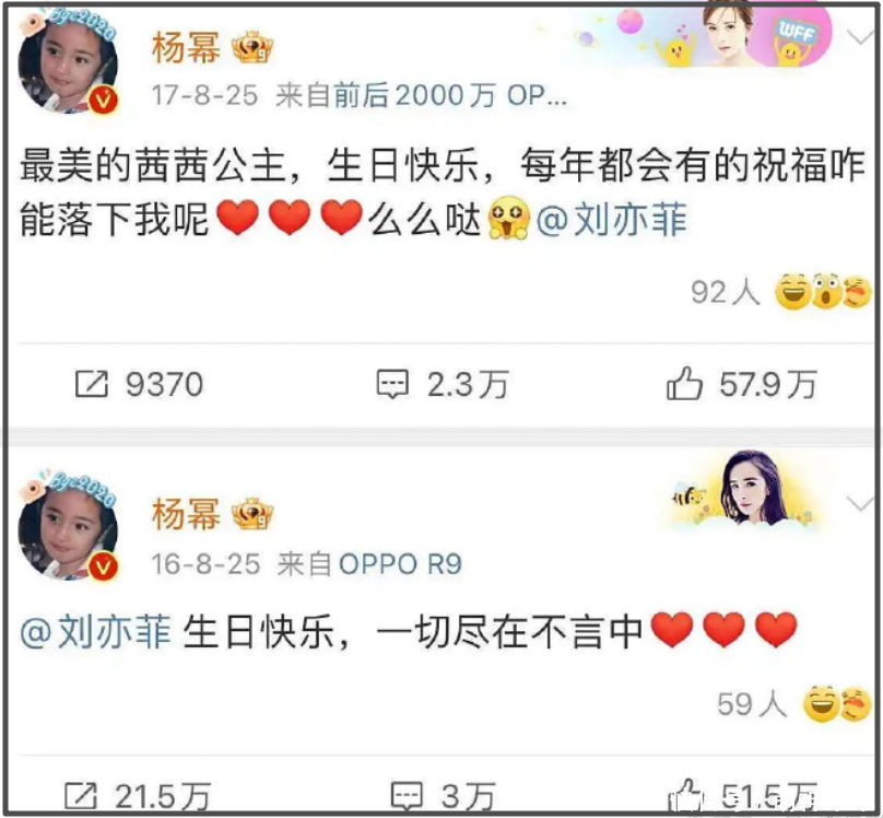 杨幂也曾给刘亦菲每年送过生日祝福,但2017年左右开始就没了。大众印象里,杨幂和刘亦菲正是因为那句“杨幂之后再无白浅”决裂的,
