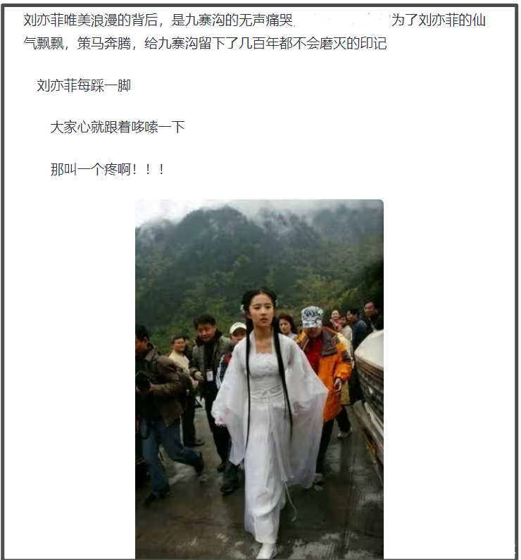 刘亦菲在《神雕侠侣》剧组可谓众星捧月,光眼妆就化了六层,为了给她拍摄绝美镜头,张纪中甚至破坏了九寨沟神仙池。