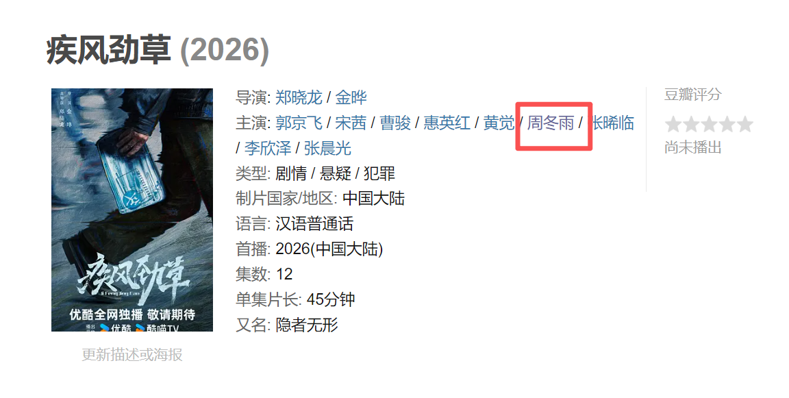 翻看周冬雨待映和待播片单,难看到和三金影后的江湖地位完全不匹配。唯一觉得卖相好的是电视剧《疾风劲草》,郑晓龙导演,然而当初电视剧片酬过亿的周冬雨,在这部的番位竟然排到了第三,在宋茜和惠英红之后。