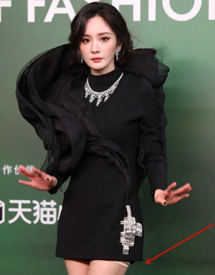 问题出在裙子稍微短了点,一不小心露出了打底裤,就特别煞风景,这是着装的细节,团队工作人员还是不够细心没考虑到。如果打底裤短一点,哪怕换成深色的打底裤都没有这么扎眼。