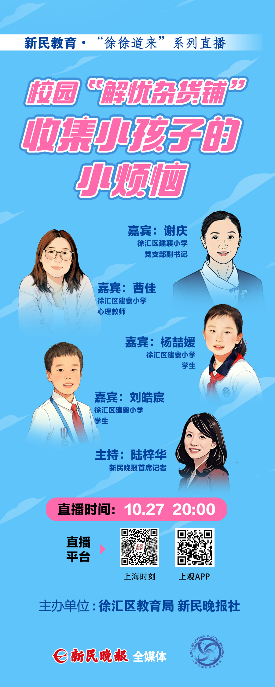 青少年的心理健康问题受到日益广泛的关注。你真的知道你的孩子会为哪些事情发愁吗?有没有合适的办法,帮他们解忧?今天20:00,徐汇区教育局和新民晚报社共同打造的“新民教育·徐徐道来”直播间将迎来两位特别嘉宾——徐汇区建襄小学四年级学生杨喆媛和刘皓宸,来讲讲生活中的小烦恼以及独属于“15后”的烦恼消除大法。建襄小学党支部副书记谢庆和心理教师曹佳则将结合该校原创读本《哇!烦恼不见了》,聊一聊校园“解忧杂货铺”如何听懂孩子们的心事,并用合适的方法帮助他们增强心理韧性。